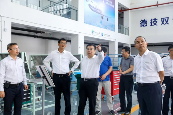张汉林一行先后调研考察我校航空学院产教融合实训基地、建工学院古法营造实训基地和廉政文化主题公园。汤健校长代表学校向张汉林主任一行汇报了学校在职业教育招生办学、校企合作、产教融合、实习就业、改革发展等方面取得成绩和下一步的工作打算。