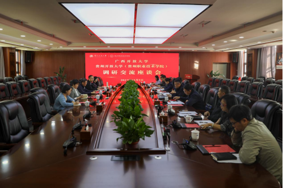 座谈会上,双方深入探讨与分享了开放教育与职业教育融合发展、绩效考核、干部队伍建设、校企合作等方面的最新动态和宝贵经验。李卫东书记表示此行深受启发,收获满满,对今后双方进一步密切合作、互学互鉴奠定了坚实基础。宋广强书记对广西开放大学李卫东书记一行到访表示热烈欢迎,广西与贵州一衣带水、山水相连,地缘相近、人文相亲,本次到访交流是双方学校增进了解、增强友谊、深化交流、长期合作的新起点,必将为两校长期合作发展注入新的动力与活力,为两地教育事业的高质量发展作出更大的贡献。