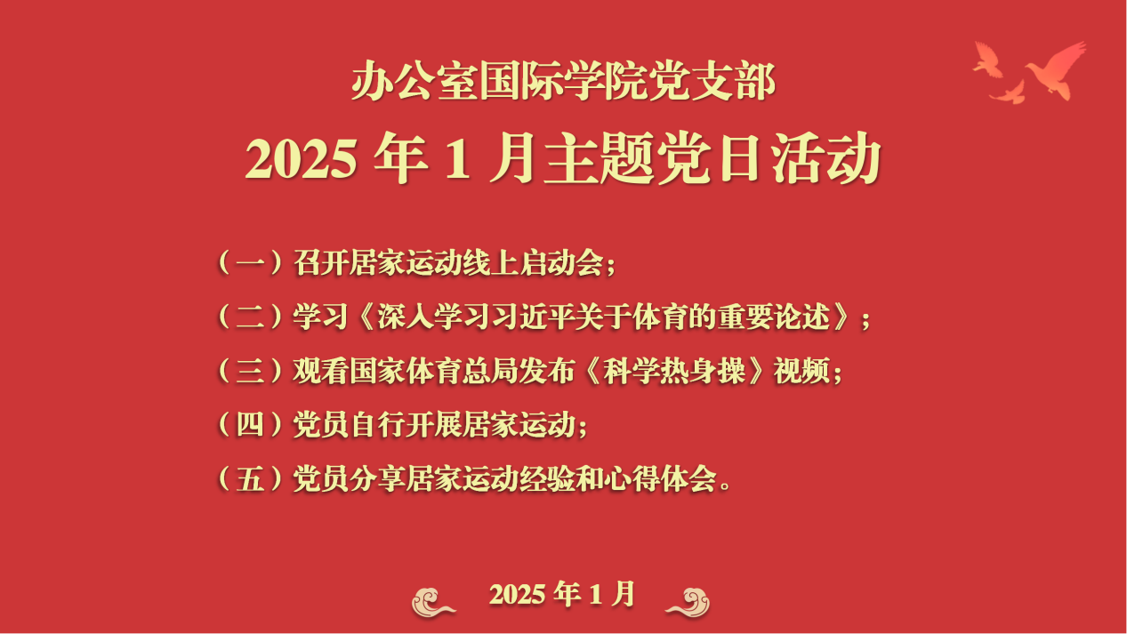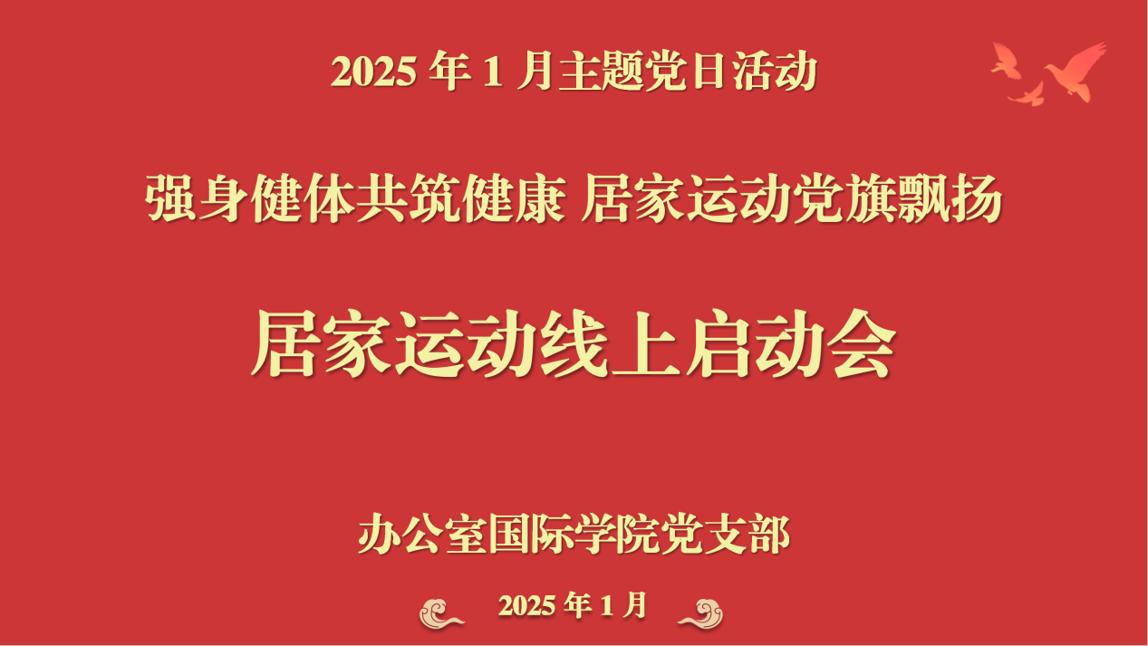 为进一步增强党员的身体素质,倡导健康的生活方式,推广健康的生活理念,鼓励党员在日常生活中保持良好的运动习惯,激发广大党员教师积极向上的精神风貌,1月18日上午,办公室国际学院党支部组织全体党员开展了“强身健体共筑健康 居家运动党旗飘扬”主题党日活动。