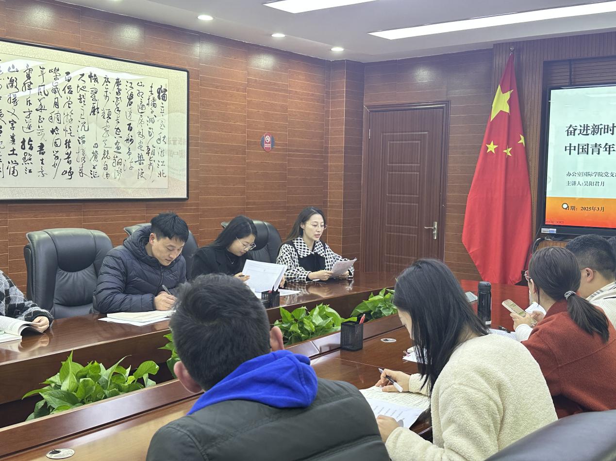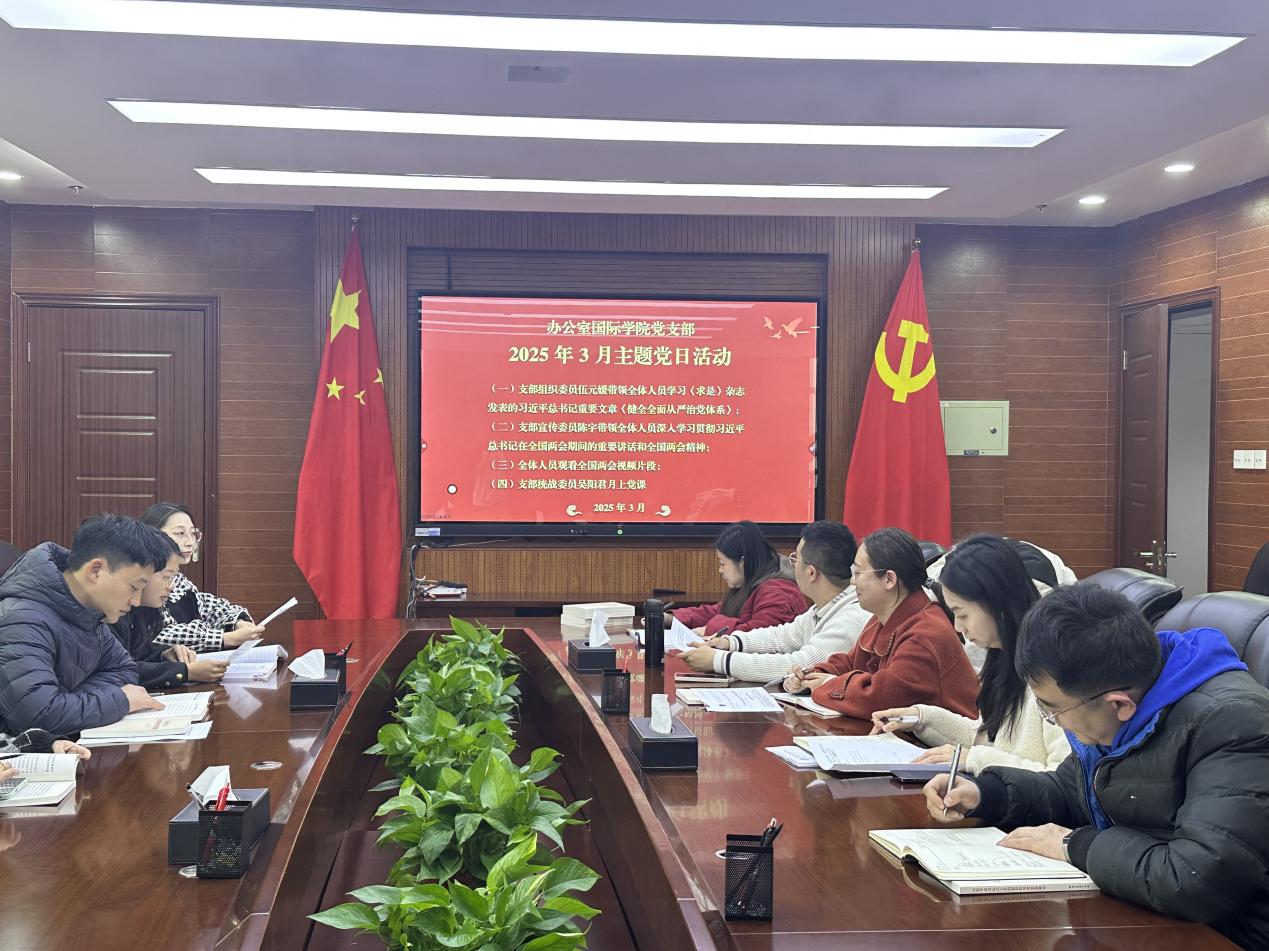 为深入学习贯彻2025年全国两会精神,引导全体党员统一思想、明确方向,切实将两会精神转化为推动学院高质量发展的行动指南,3月27日下午14:00,办公室国际学院党支部在学校云潭南路校区行政楼6楼会议室开展“学习两会精神 凝聚奋进合力”主题党日活动,办公室国际学院党支部全体党员、入党积极分子、在编教职工参加了本次活动。